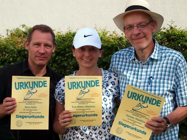 Im Ganzen also sehr gelungen war das Joggathon-Fest 2014 - und wenn es 2015 wenigstens Zelte zum Umkleiden, Toiletten in ausreichender Zahl und vielleicht sogar Duschen gibt, könnte die Rekordveranstaltung unter Umständen noch einmal übertroffen werden, weil es dann noch leichter wäre, Mitläufer für die Sache zu gewinnen. Ich bin gespannt. Und vor allem aber rundum froh und dankbar, dass ich zehn Runden geschafft und damit dank meiner Sponsoren 245,00 Euro zum guten Zweck beigetragen habe.